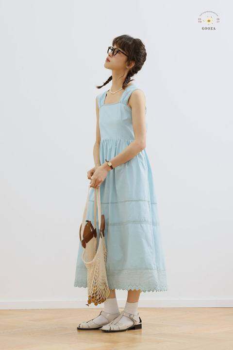 GOOZA 薄荷味之夏 法式复古少女重工绣花花边宽肩带吊带a字连衣裙