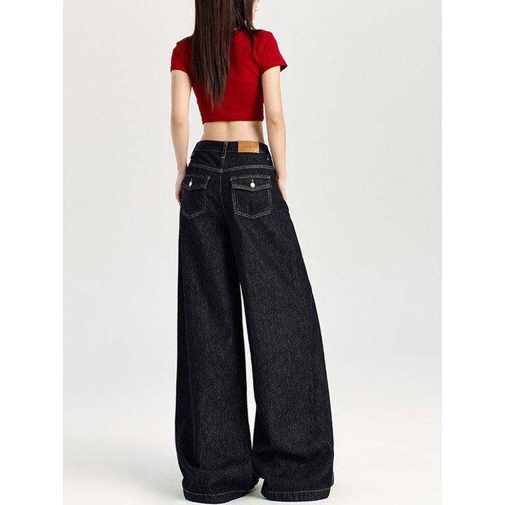 春秋2024新款深蓝色阔腿牛仔裤女ins超火水洗直筒拖地裤高腰长裤