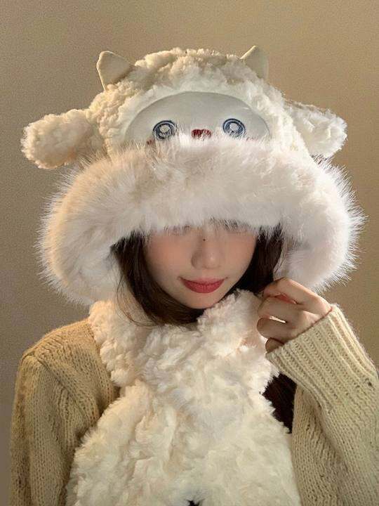 冬季新款可爱小绵羊毛绒帽女帽子围巾一体加厚防寒保暖甜美雷锋帽