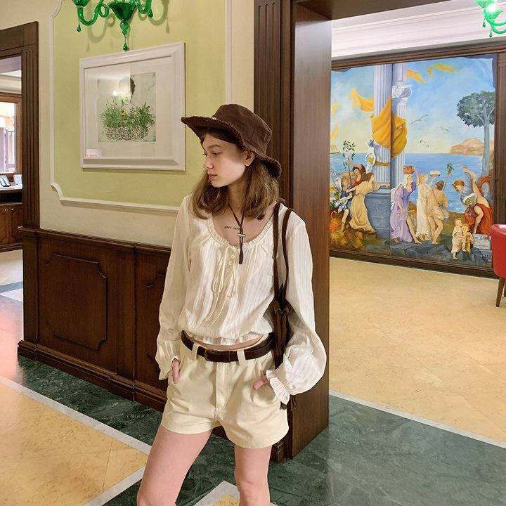 KERNEL COSMOS 海滨季风 法式复古花边方领系带棉质提花甜美上衣