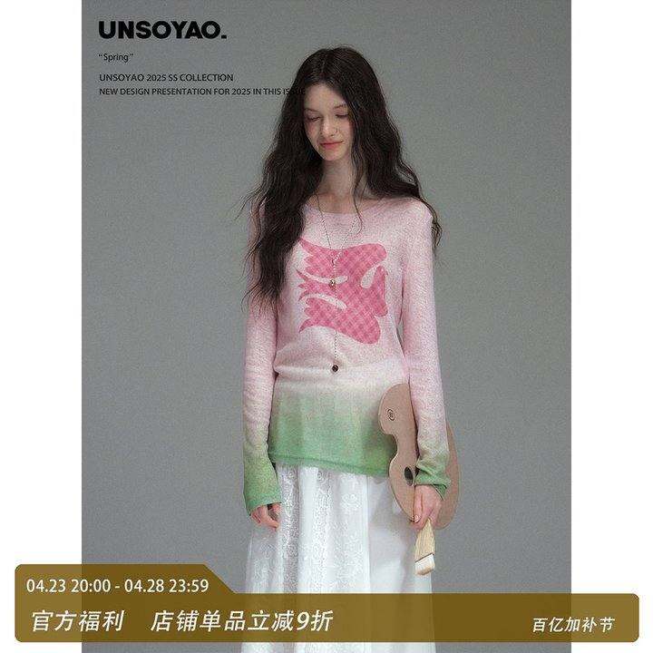 UNSOYAO 25SS“moonstrand”粉月礁艺术浪漫印花渐变防晒长袖T恤