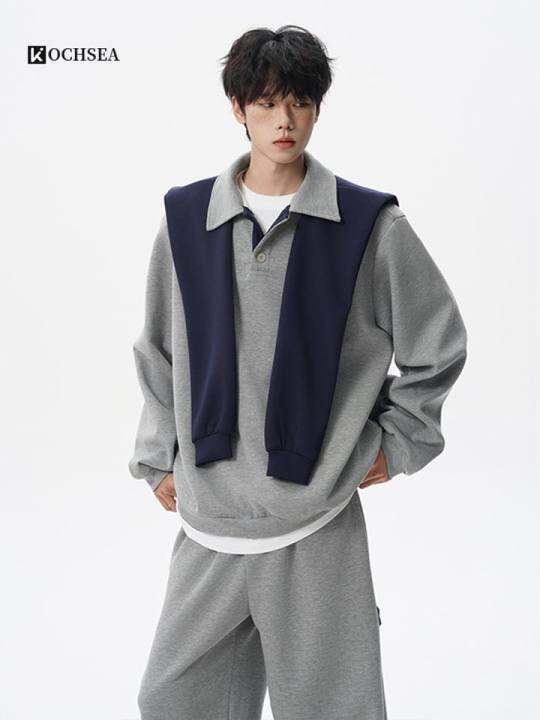 美式披肩撞色翻领卫衣套装男秋季新款宽松时尚直筒休闲卫裤两件套