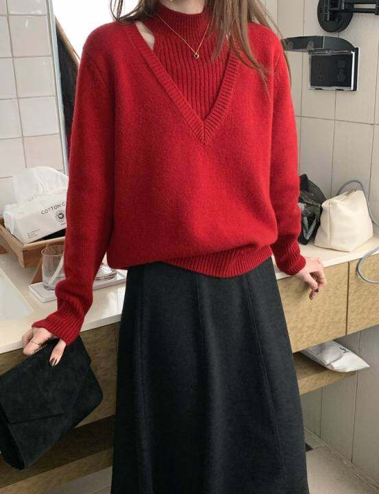 限购1件 ! 挂颈假两件设计新年毛衣 慵懒风情兼具