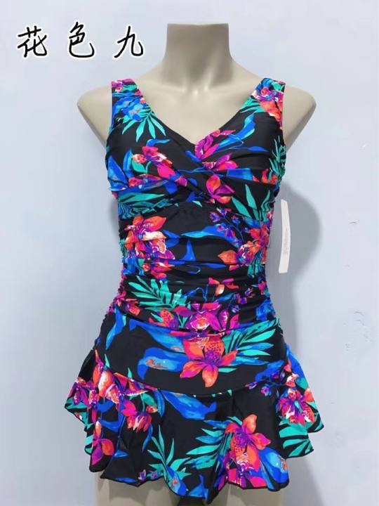 Amber外单 胖MM超大码泳衣女士保守裙式连体遮肚显瘦温泉 带胸垫