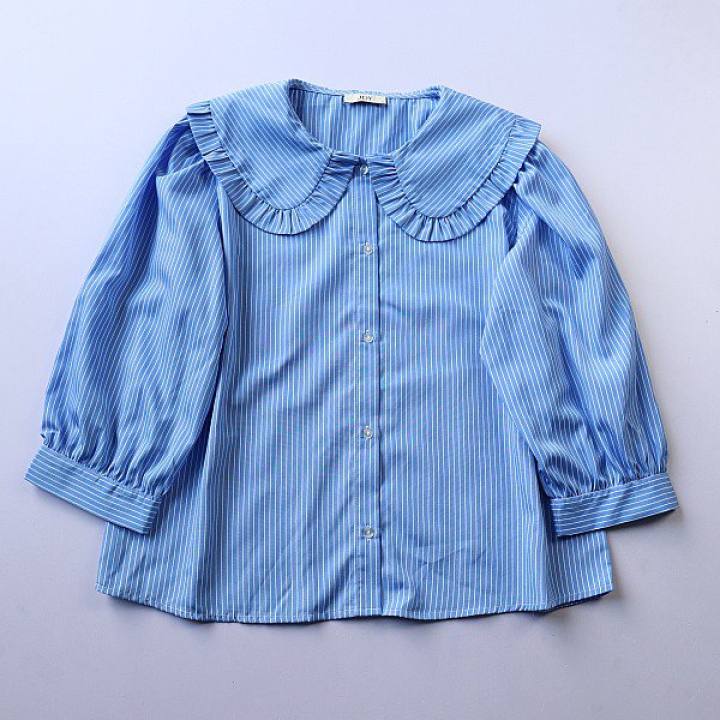 春季新款欧美女士娃娃脸七分袖条纹衬衫 简约休闲短款开衫衬衣D12