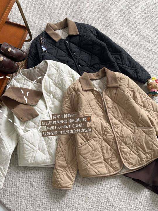 巴恩风穿搭!绵羊毛夹层领子可拆拼色菱格棉衣女保暖外套