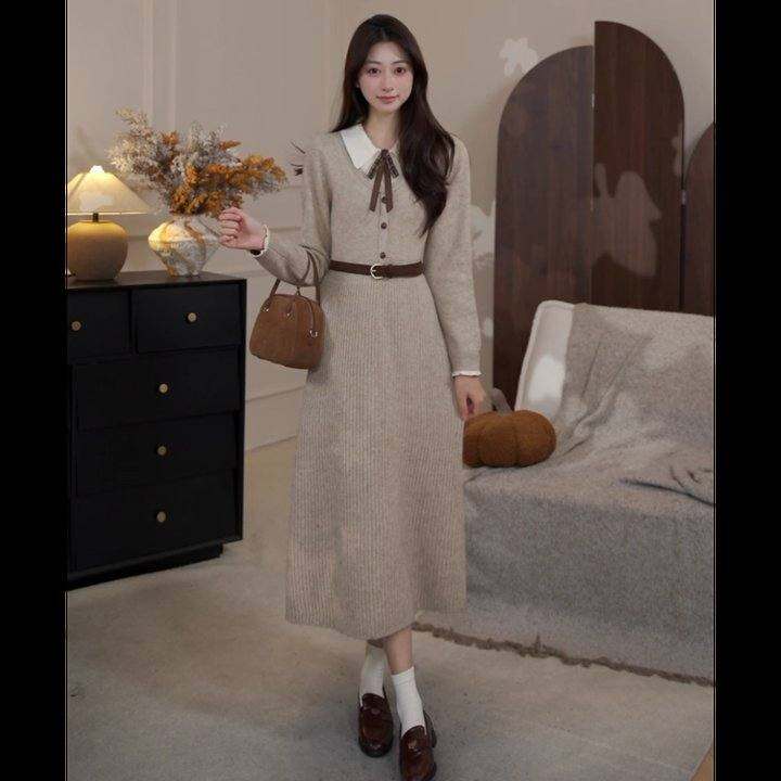 鹿向南「半糖摩卡」假两件法式长袖针织连衣裙女秋季收腰杏色长裙