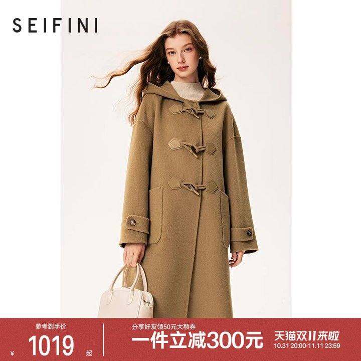 诗凡黎全羊毛连帽牛角扣毛呢外套2024冬新款学院中长双面呢大衣女
