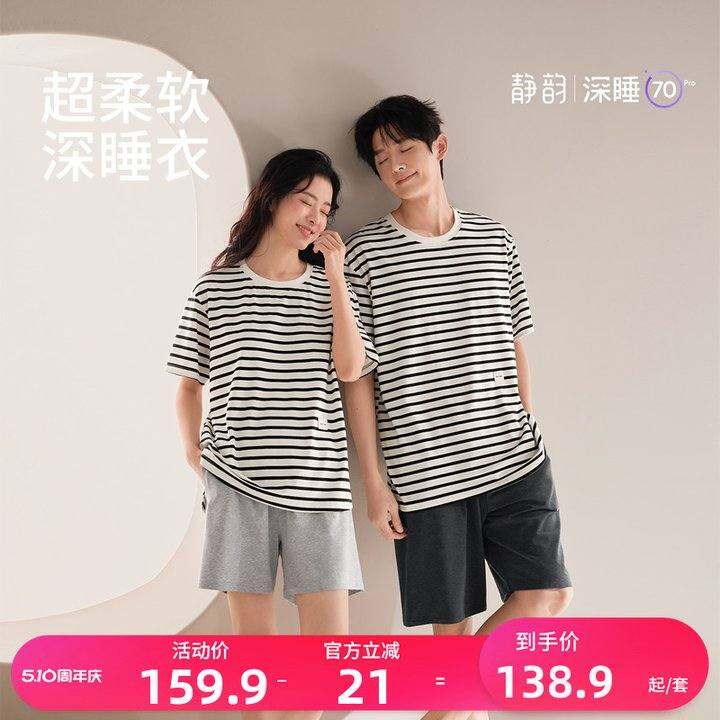 静韵【凉感深睡衣70】超柔软情侣睡衣女夏款防螨条纹家居服男套装