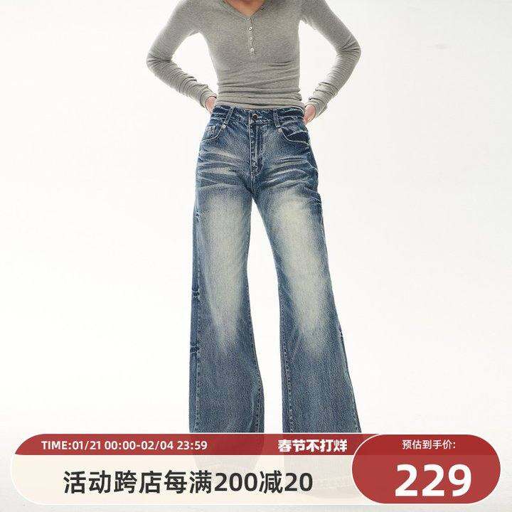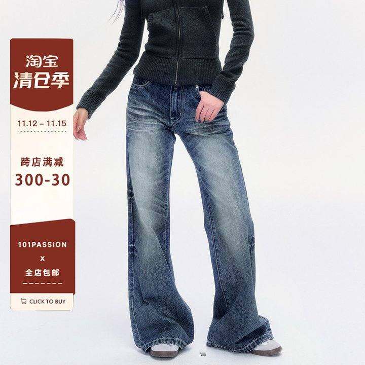 101PASSION美式复古微喇叭牛仔裤女秋冬高级感做旧蓝色低腰长裤子
