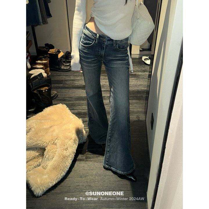 SUNONEONE 低腰紧身牛仔裤女春秋季复古蓝水洗磨白休闲微喇叭裤子