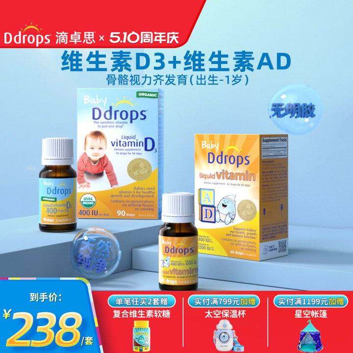 Ddrops婴幼儿维生素D3滴剂+维生素AD促钙吸收滴剂0-1岁适用组合装