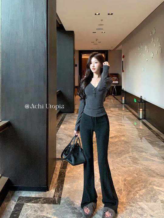 ACHI大也池重磅桑蚕丝羊毛黑色微喇休闲裤女宽松抽绳长裤显瘦裤子