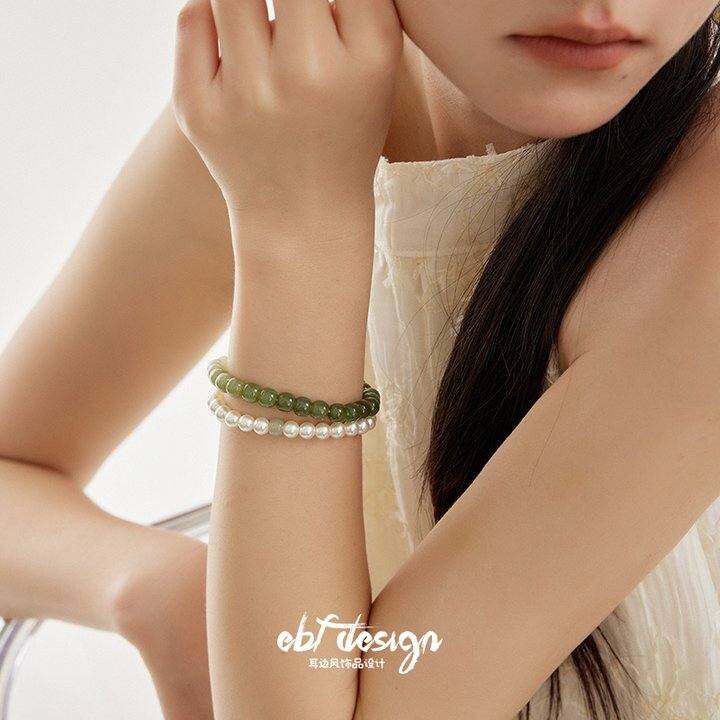 EBFWIND青墨 新中式夏天叠戴天然和田玉石渐变仿珍珠单颗白玉手串