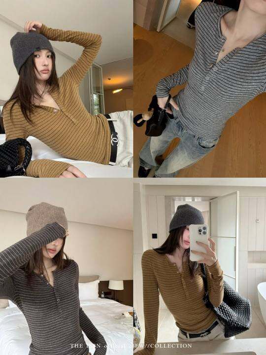 NEW 10.03 11:00 ~宁司半开领条纹修身长袖T恤女秋季韩系显瘦上衣