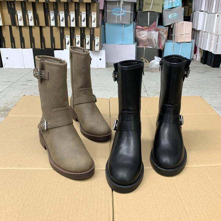 外贸原单女鞋新款圆头秋季粗跟纯色百搭舒适外穿金属扣马丁靴