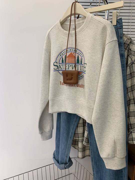 灰色加绒加厚欧货圆领短款卫衣女春秋秋冬冬季小个子2023新款爆款