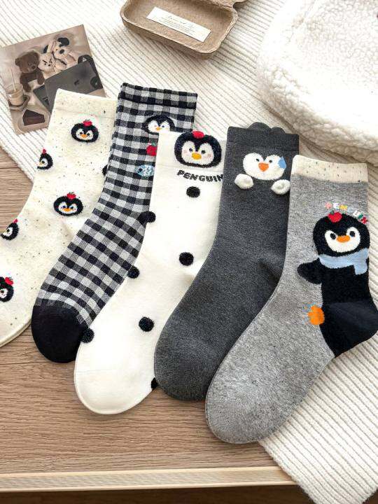 卡拉美拉2025秋冬新款棉袜女士中筒袜子可爱企鹅透气吸汗搭配女袜