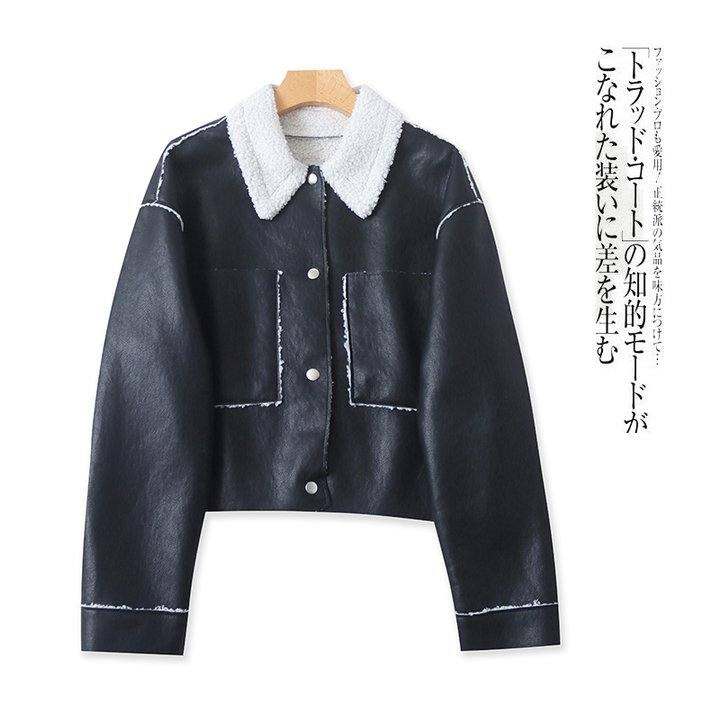 PU软皮外套秋冬新款外贸女装翻领纽扣口袋羊羔绒宽松时尚13021