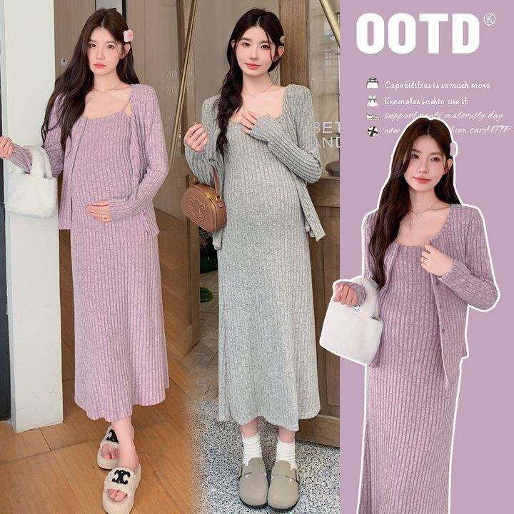 孕妇秋装连衣裙2024新款小香风长裙秋冬两件套修身针织吊带裙春秋