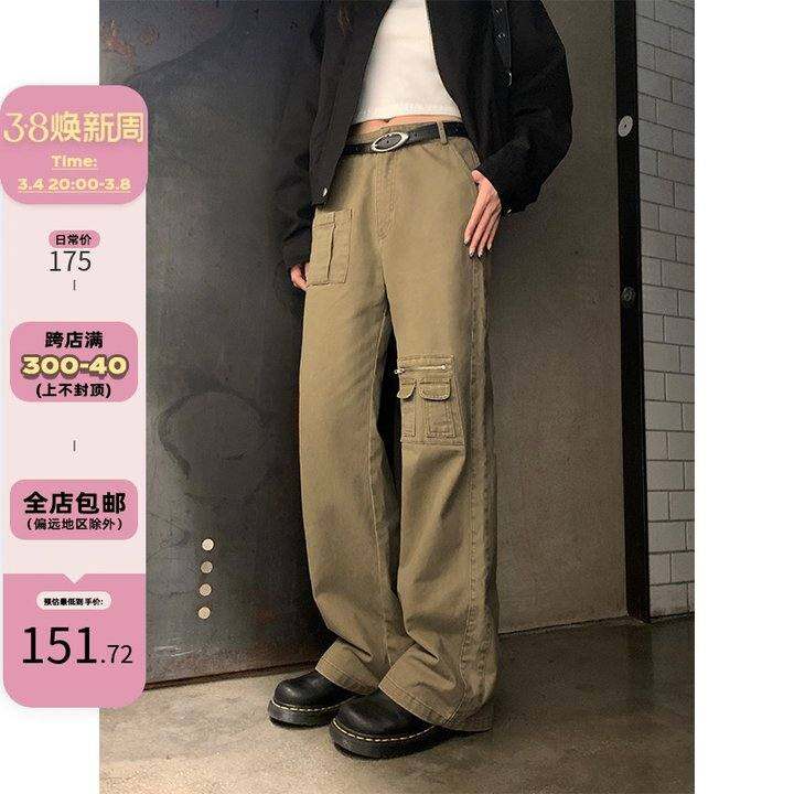 RAINY 复古微喇多口袋工装裤春秋女百搭高腰纯色直筒显瘦休闲裤子