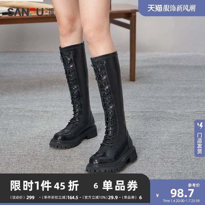 三福长靴女2023冬季新款复古机车绑带厚底增高高筒靴骑士靴824737