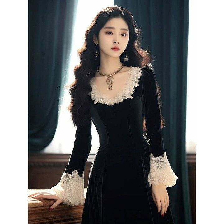 2024年秋冬新款黑色金丝绒连衣裙2023丝绒气质高级感礼服裙子女装