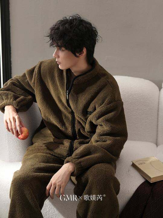 秋冬季加绒加厚睡衣男士驼绒大码珊瑚绒可外穿保暖拉炼外套法兰绒