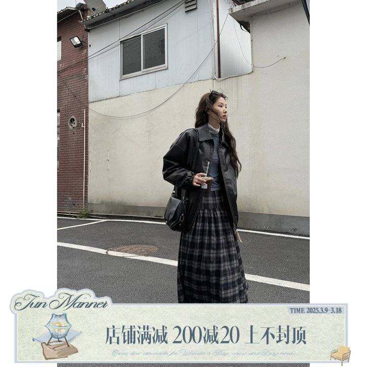 JMwomen 雾蓝调拼接格子半身裙女春秋中长款复古宽松高腰a字长裙