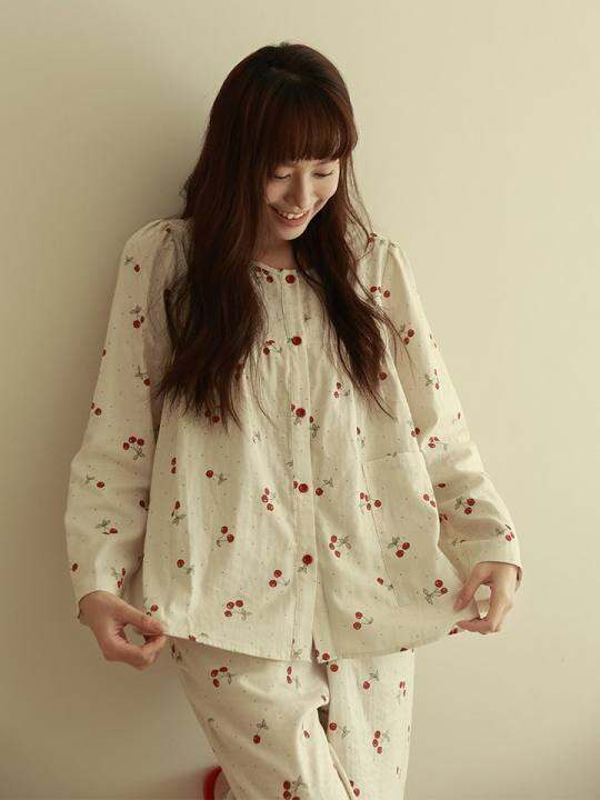 波点小樱桃 纯棉双层纱少女甜美印花纱布长袖长裤家居服睡衣套装