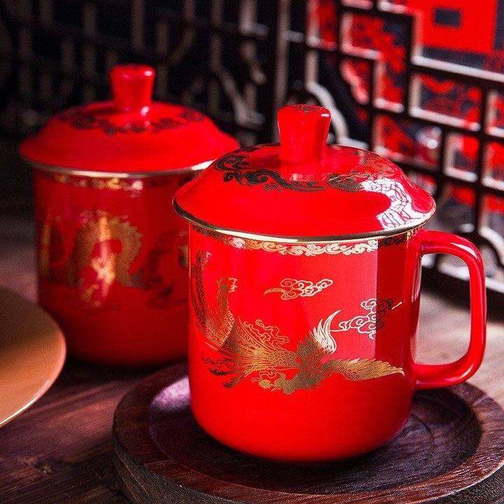 红色陶瓷茶杯带盖骨瓷将军杯诗词福寿杯喜庆水杯印LOGO刻字