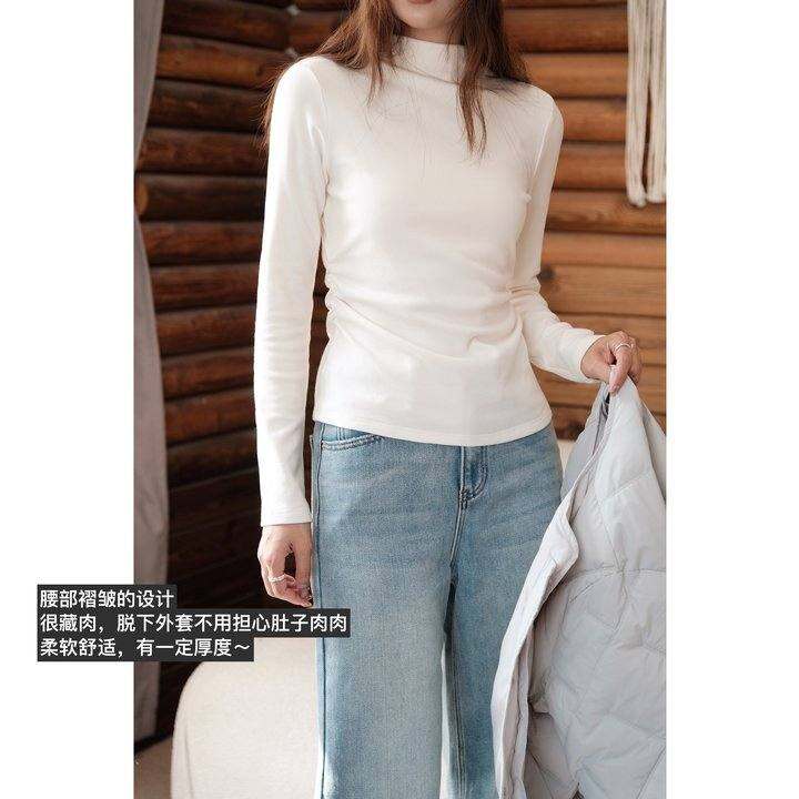 Ahui 冬季新款拉毛半高领打底衫收腰收褶显瘦百搭高弹力T恤女