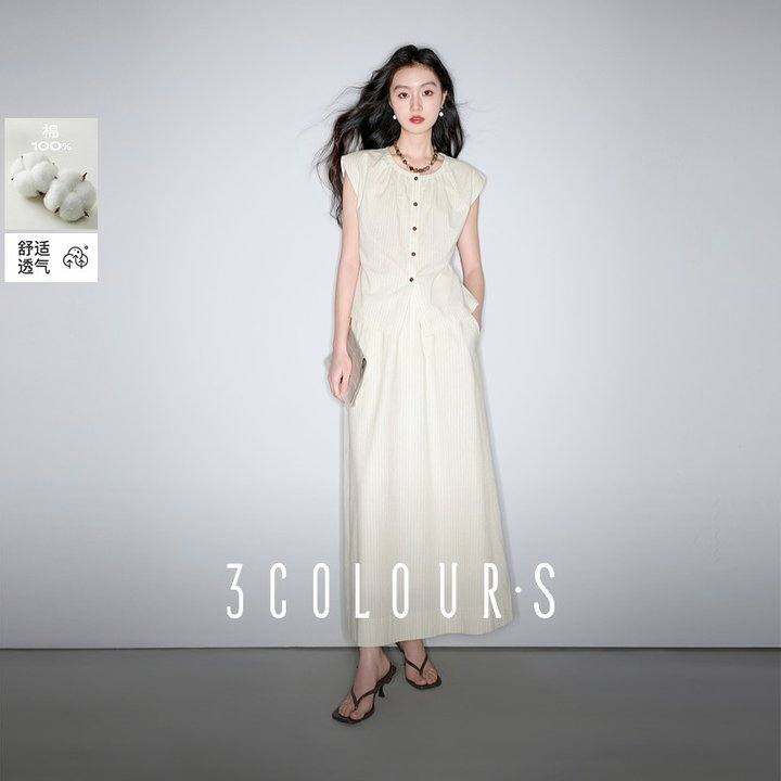 三彩2025夏季新款条纹套装圆领上衣松紧腰半身裙两件套通勤S