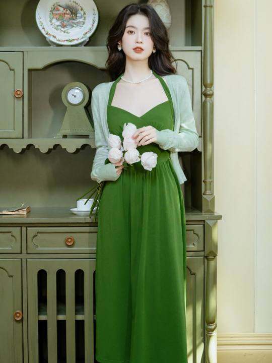 法式绿色挂脖连衣裙套装女2024年春季新款气质女装裙子质感高级感