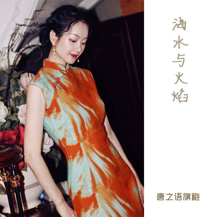 晕染风格印花时尚日常年轻款少女中国风旗袍2023夏季 海水与火焰