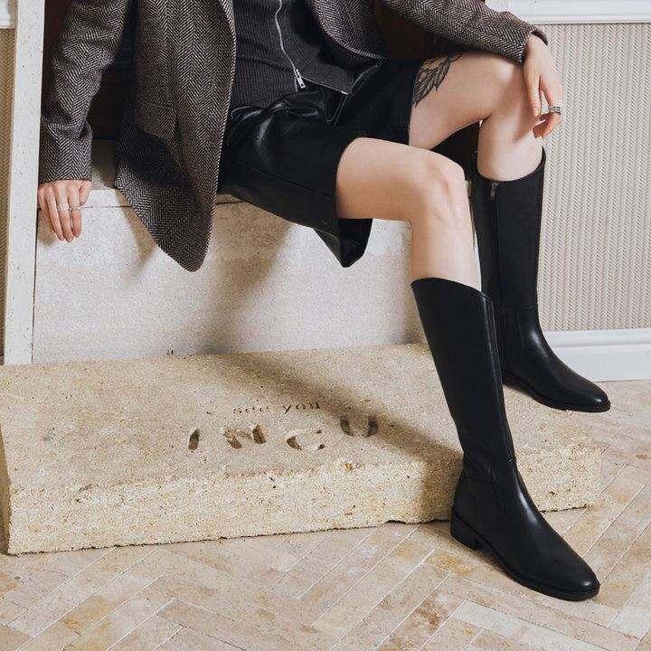 内外真皮侧拉链长筒骑士靴粗中跟高筒女鞋小个子增高瘦瘦不过膝靴