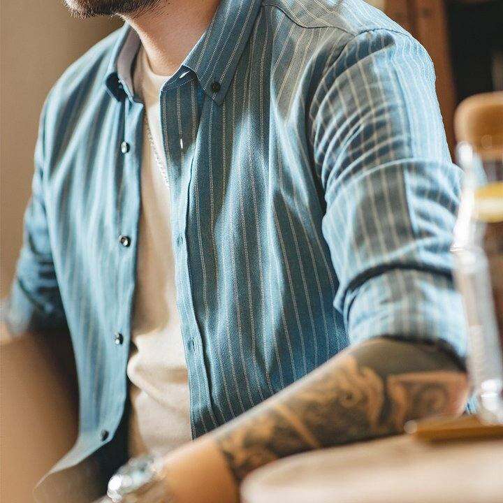 马登工装 美式覆古磨毛阿美咔叽蓝色竖条纹长袖衬衫休闲 𫔮衬衣男春