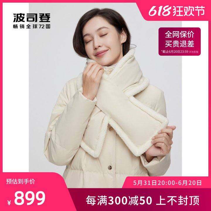 波司登奥莱轻量环保女士中长款立领设计拼接仿羊羔绒围巾羽绒服