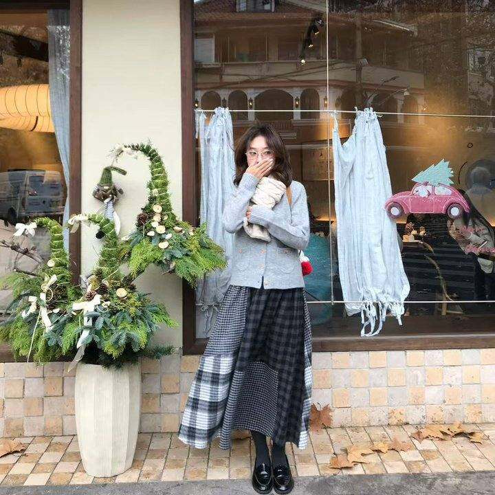 羊驼羊毛圆领木扣针织开衫+日系感不规则重工拼接毛呢格子半裙