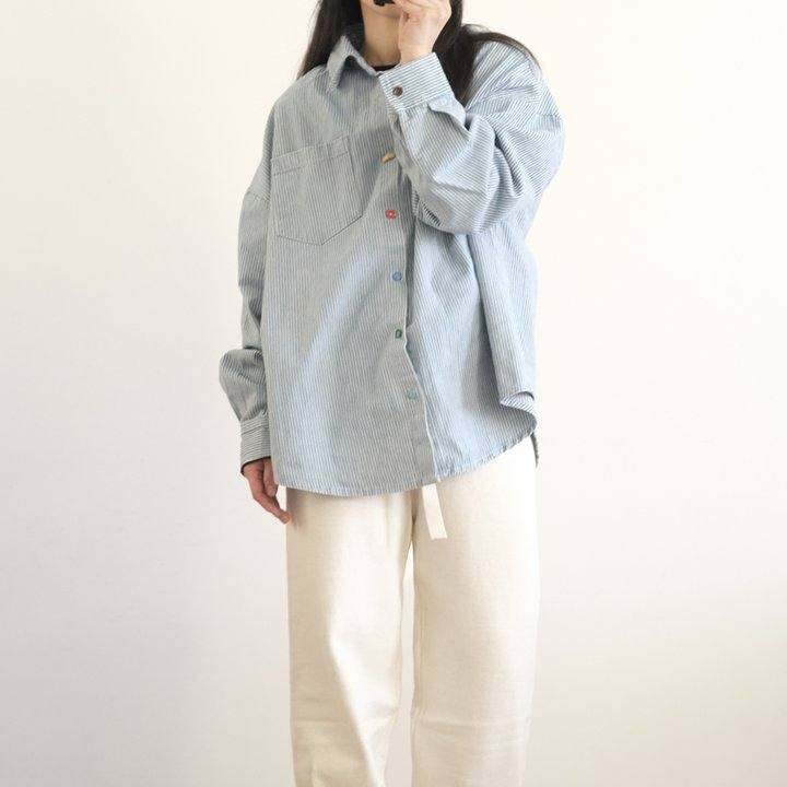 春秋款宽松范纯棉牛仔条纹衬衫