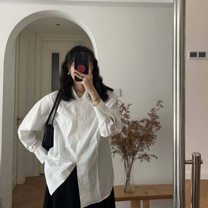 夏装新款 法式简约优雅褶皱尖领翻领长袖衬衫纯色白色衬衣 0.24KG