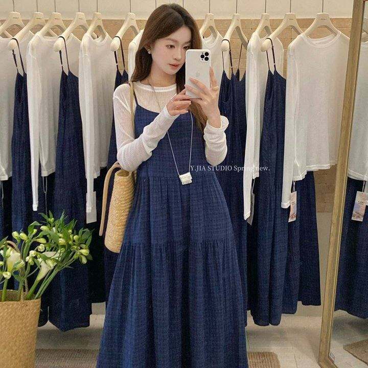 复古叠穿格子吊带连衣裙+宽松慵懒长袖T套装裙2025慵懒风舒适套装