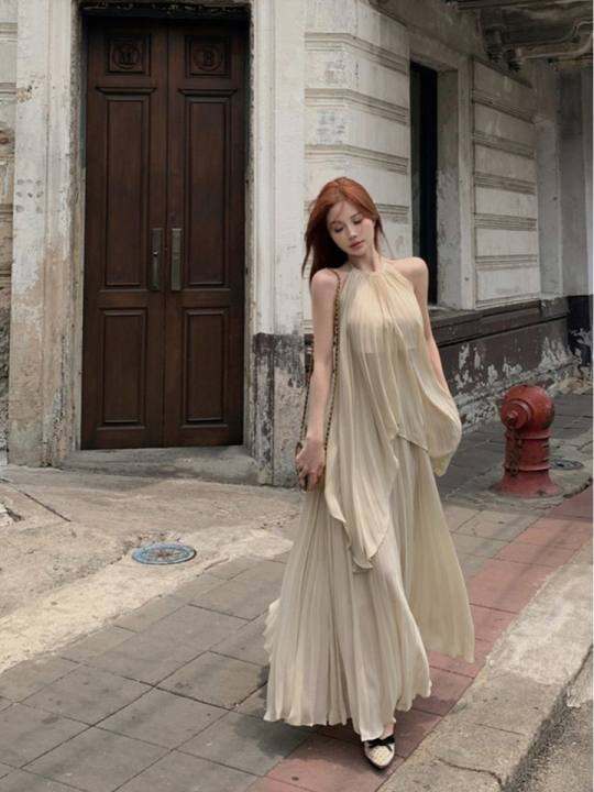 茶系穿搭套装辣妹露背不规则挂脖背心上衣女夏季百褶半身裙两件套