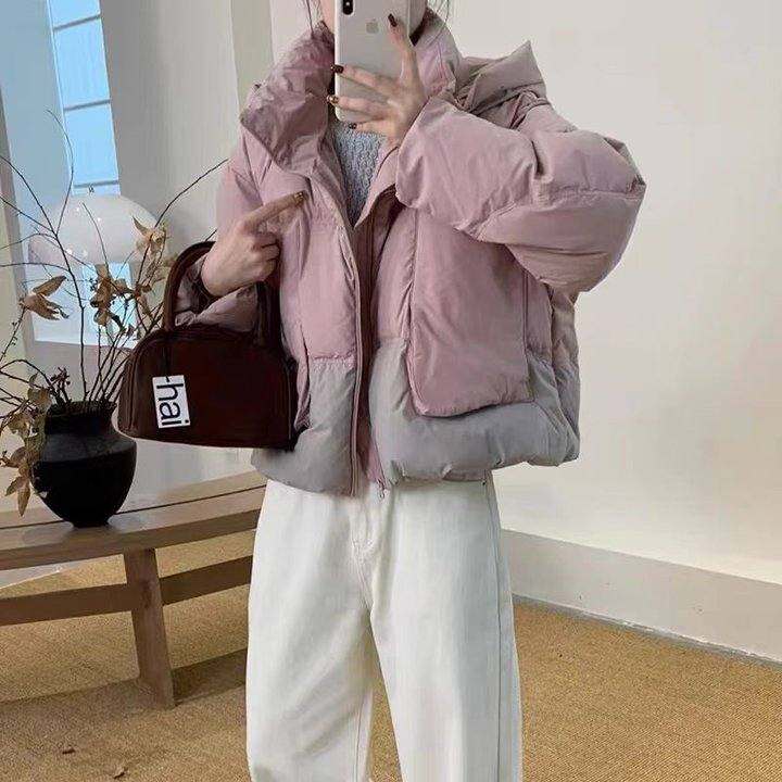 牌子货 256g 90绒白鸭绒 拼色短款面包羽绒服 退货拉黑