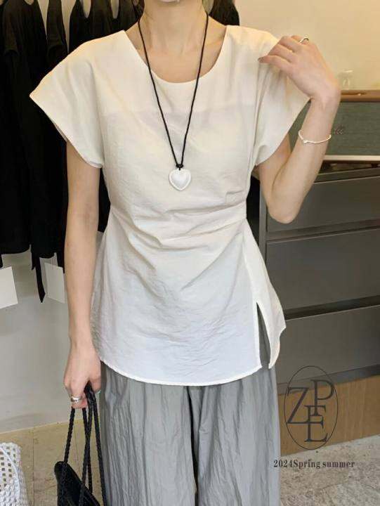 Ze Pe 韩系设计感侧捏褶开衩小衫气质修身显瘦百搭收腰上衣女