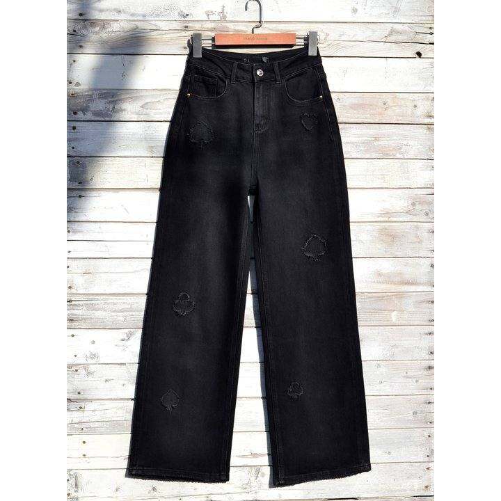 欧单 美妙细节 水洗净面黑色直筒微阔腿牛仔长裤,版型流畅漂亮