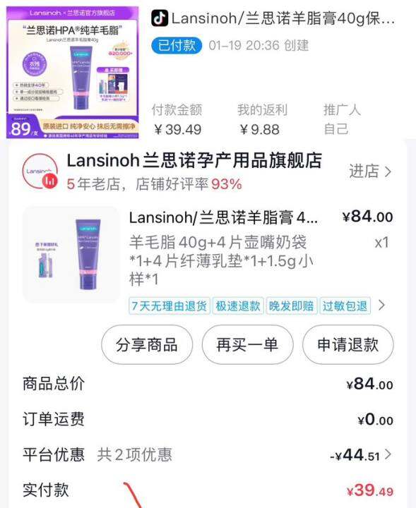 #待产包 羊脂膏 不知道好不好用 也有推荐美德乐的 先备着吧 30块钱到手40g还有一点小赠品 用不上的话 做脚膜应该也能用 返利用的:小查生活 微信直接搜就行 价格是刷券来的 六折券叠加凑平台券150-20