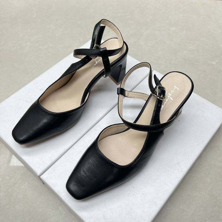 2024年新款法式复古方头粗跟高跟鞋女夏百搭一字带包头凉鞋单鞋子