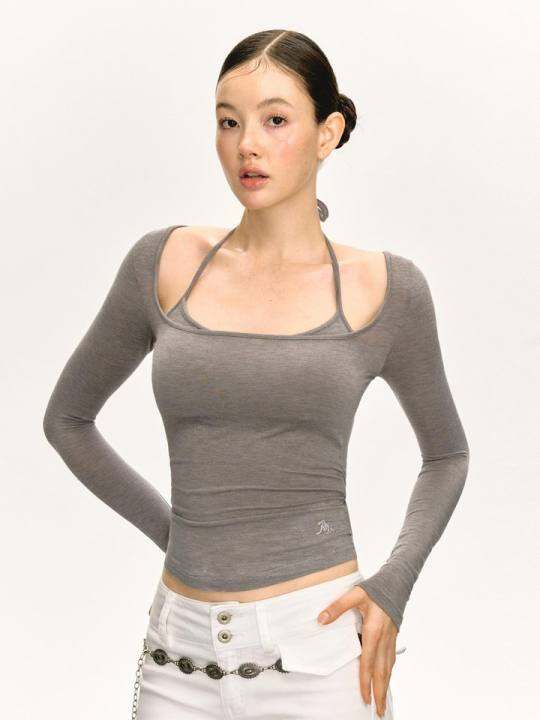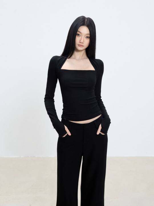 Ariseism 美式设计感假两件长袖T恤女秋季新款打底修身短款上衣