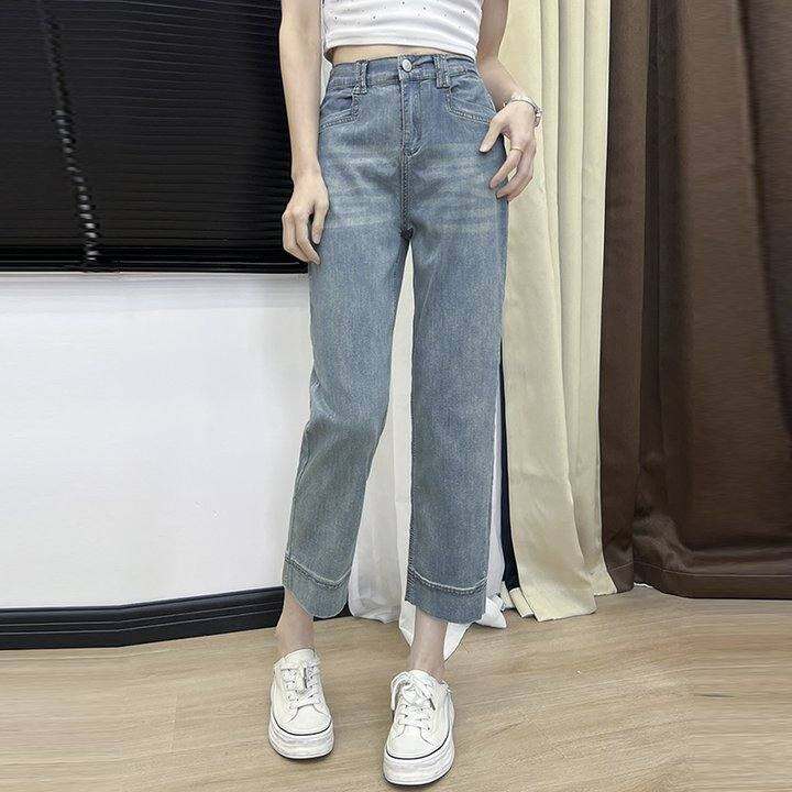 大码牛仔裤女八分2024夏季薄款胖mm200斤显瘦半松紧腰弹力直筒裤